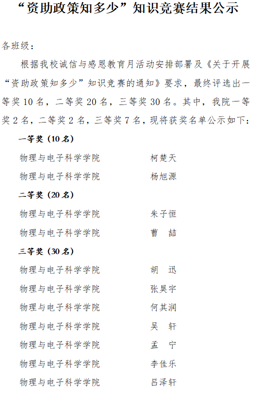4月是学校诚信与感恩教育月,为面向全院师生宣传和普及国家及学校各项资助政策,进一步弘扬社会主义核心价值观,构建大学生诚信感恩教育体系,根据《伟德国际19462023年诚信与感恩教育月活动实施方案》中关于开展“资助政策知多少”知识竞赛的要求,学院结合工作实际,开展了“资助政策知多少”知识竞赛,物电学子在“资助政策知多少”知识竞赛中获得了良好的成绩。通过本次比赛,使同学们深入了解了国家资助相关知识。