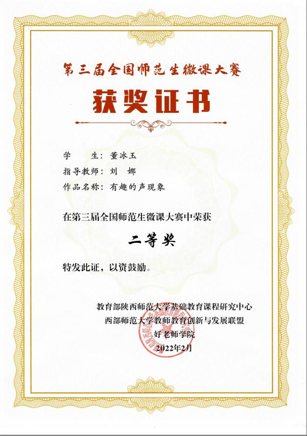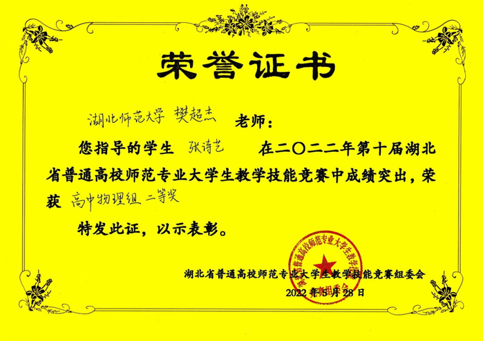 1901班张诗艺获得湖北省师范生教学技能竞赛二等奖