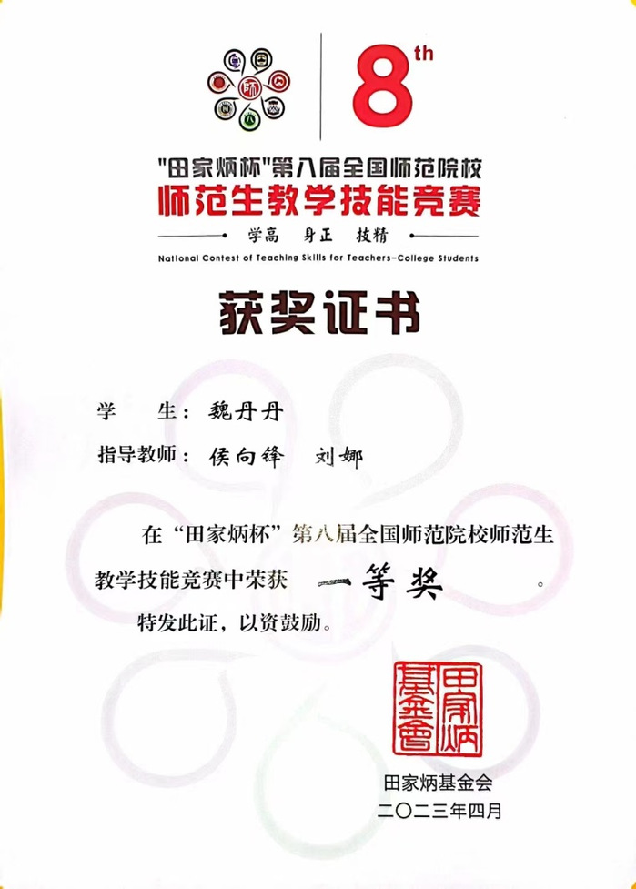 2001班魏丹丹获全国师范生教学技能竞赛一等奖