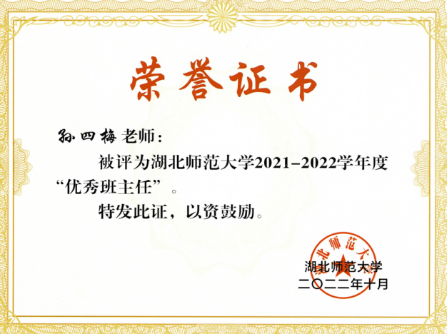作为本科班主任和研究生导师,对待学生们如自己的弟弟妹妹,给予他们足够的关爱,支持,理解,耐心和包容。她时刻关心学生的身体健康状况,曾两次遇到实验室研究生头昏呕吐,主动送学生就医,被告知诊断为头部眩晕症,长期主动关心学生减少久坐多多运动;当班级学生在寝室发生呕吐不止情况,下课后第一时间赶往寝室,送学生就医,被告知诊断为颈椎病后,长期嘱咐该学生及其他学生少呆在寝室、多出去运动。她时刻关心学生们的心理状况,对班级个别无法适应大学生活,注意力难以用在学业上的学生,以办公室谈话,查寝谈话等形式,长期对其进行心理疏导和鼓励支持,并引导其走上学业的正轨。她时刻关心学生们的学业,常常帮助学业预警的学生,通过与任课教师沟通组织成绩优秀的学生建立帮扶小组,鼓励学生持之以恒克服学业困难,带着学生慢慢走出困境。孙四梅老师所带物电学院2016级05班和2020级07班均获得优秀班集体,并两次获得优秀班主任荣誉称号。