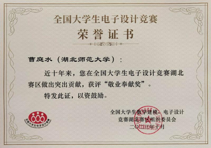 会上,湖北赛区专家组宣读了2023年全国大学生电子设计竞赛获奖名单。物理与电子科学学院曹庭水、彭琦老师指导的作品“信号分离装置”获全国二等奖、“信号调制方式识别与参数估计装置”获湖北省三等奖;李艳生、王永贺老师指导的作品“运动目标控制与自动追踪系统”获湖北省三等奖。曹庭水老师获得敬业奉献奖,该奖表彰曹老师在过去十多年来对全国大学生电子设计竞赛做出的突出贡献。