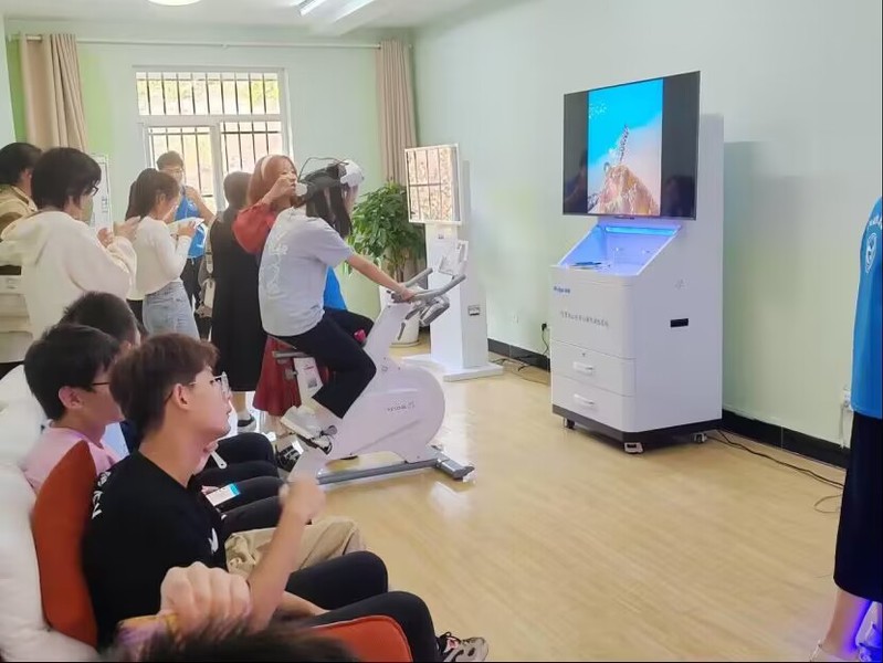 冰凌花心理健康服务队的志愿者们向学生介绍了各种仪器,例如幸福指数测试仪和VR技术应用小游戏。学生们都积极参与其中,感受科技的力量。