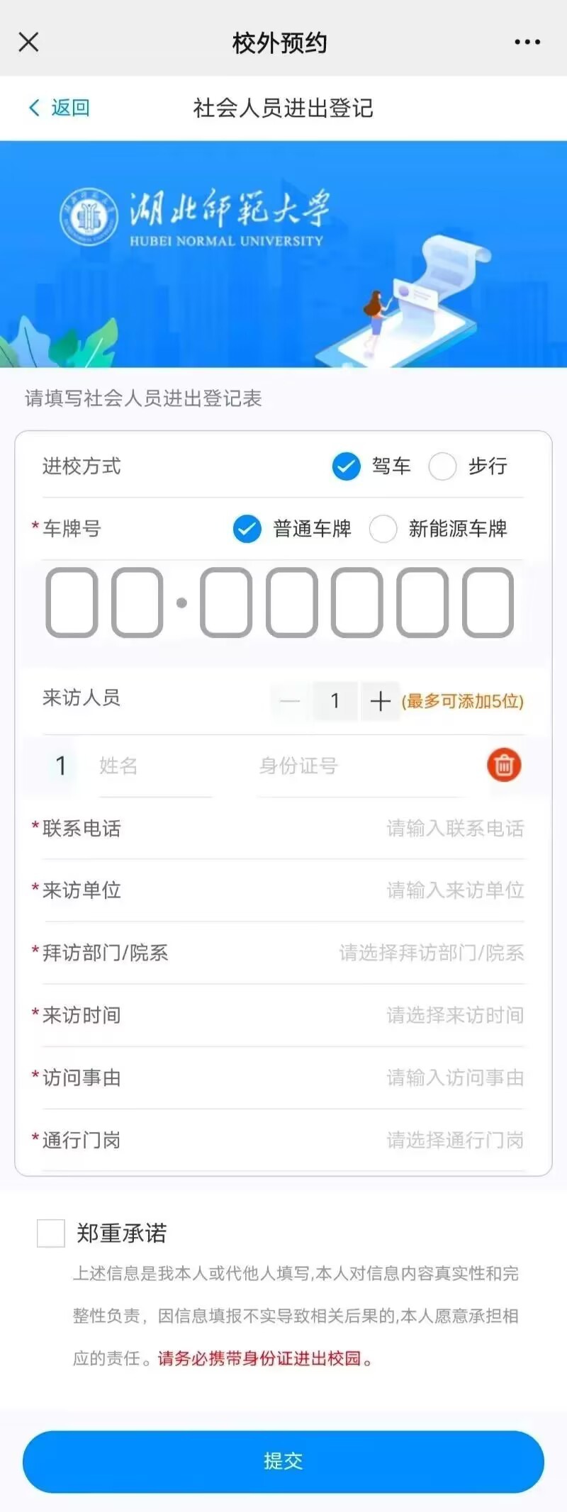 (4)点击“社会人员进出登记”,可以进行行人、车辆预约进校,预约审批通过后可进校;
