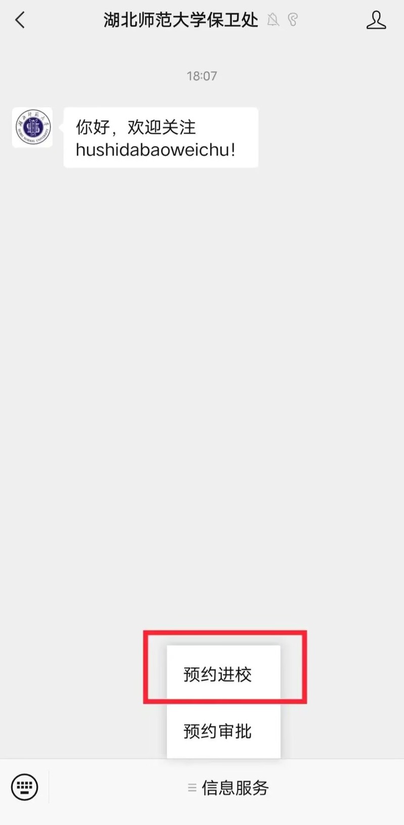 (2)进入公众号,点击“信息服务-预约进校”菜单;