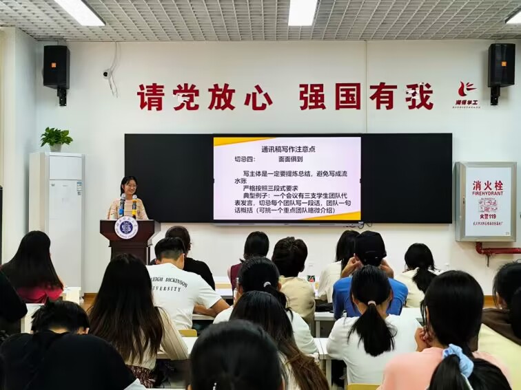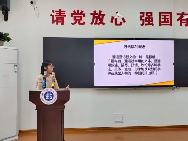 随后,程梦瑶借助六个“注意事项”进一步分析了通讯稿写作要点,从明确人称,切忌口语化叙述,到避免出现语病,用词重复问题,再到细微的遣词造句,字数要求等细节,规范了通讯稿写作的标准,并借助示范稿件进行了现场实践教学。