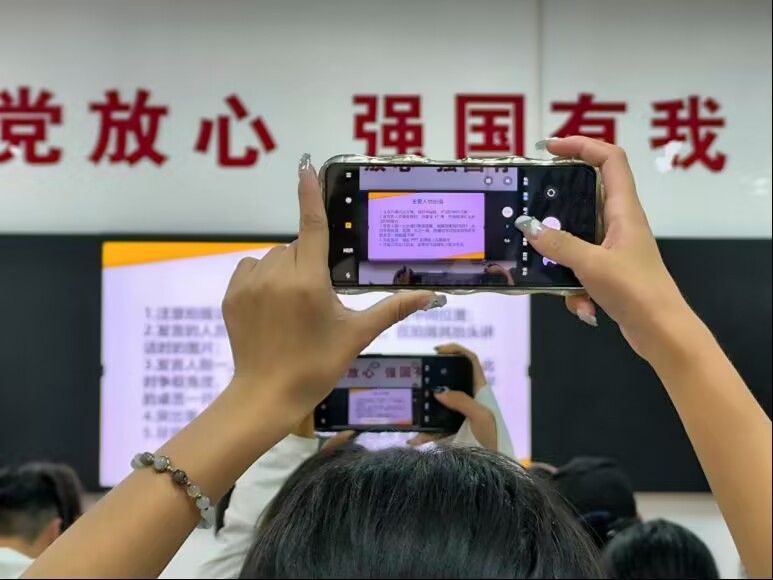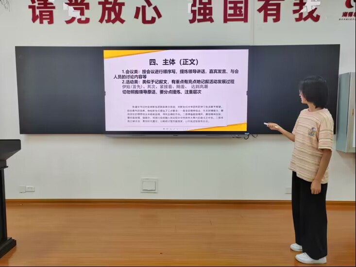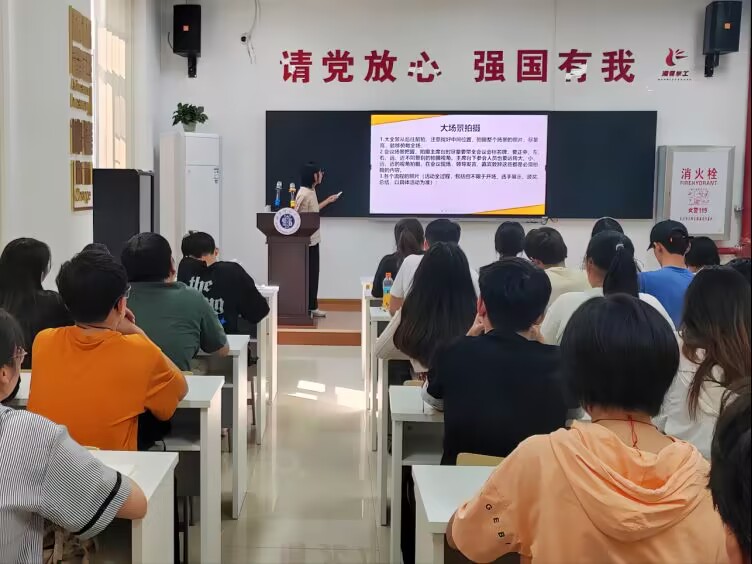 最后,程梦瑶强调了会议场景拍摄的注意事项,并对本次培训会做出总结,结合工作中常见的问题,提出建议与改正方法。她希望本次培训会后,各位学生干部都能够有所收获,进一步提高自身写作能力和拍摄水平。培训过程中,参会学生干部认真聆听并积极撰写笔记。