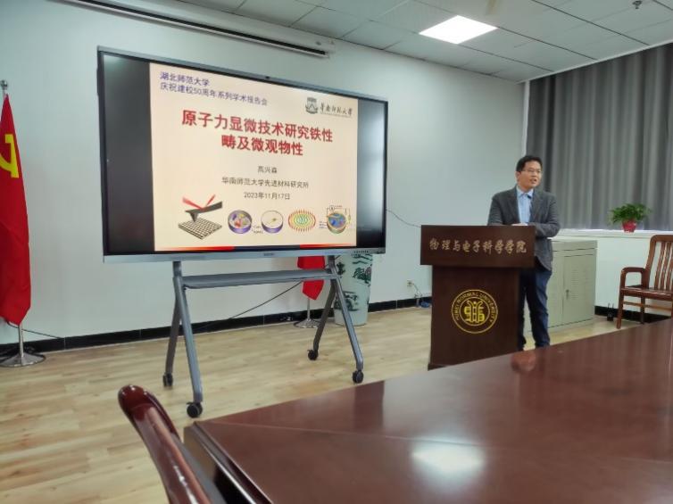 11月17日,应我校伟德国际victor1946的邀请,华南师范大学先进材料所高兴森教授来我院指导工作。下午14:30,在信息大楼10508会议室为我校师生做了题为“原子力显微技术研究铁性畴及其微观物性”的学术报告。本次报告会由刘美风院长主持,伟德国际victor1946和材料科学与工程学院师生代表参加。