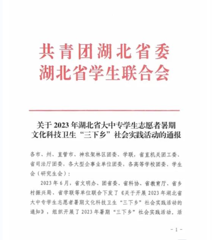 近日,共青团湖北省委公布了2023年湖北省大中专学生志愿者暑期文化科技卫生“三下乡”社会实践活动表彰结果,伟德国际victor1946“小喇叭”实践队被授予“优秀团队”称号。