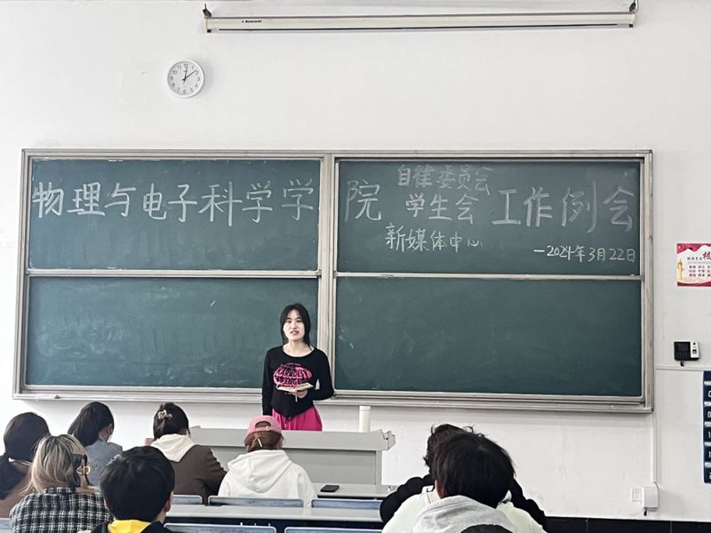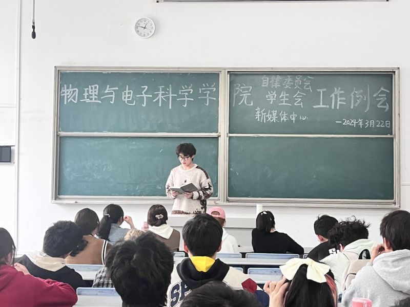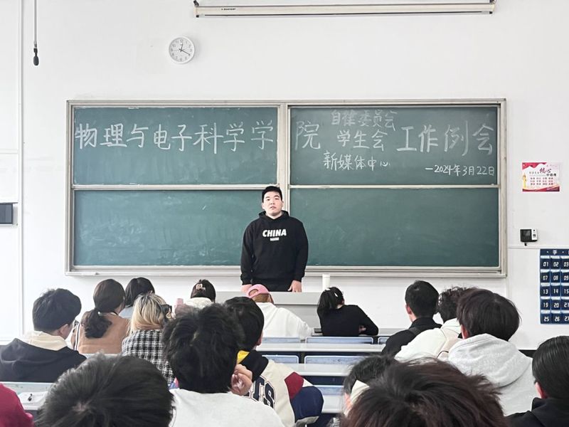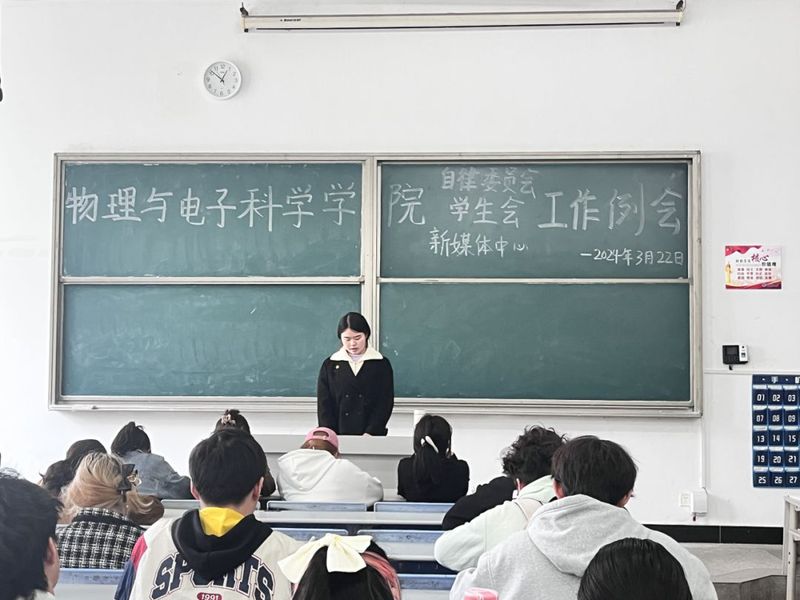 其次,辅导员田学泽讲话,他指出学生代表纪律意识要严明,同时他还强调了各班班长应积极配合学风建设部加强我院学风建设的管理,定期开展学风建设主题班会。之后,他提到换届即将来临,希望各部门部长不仅要指导干事让他们熟悉工作流程,而且要学会放手让干事在锻炼中成长。