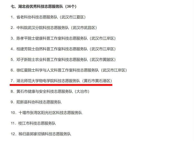 该志愿服务队是我院物理科普基地“寻物之理”科普社团队,一直以来,他们致力于物理科学知识普及和推广,积极与机关、社区和中小学合作,开展科普讲座、科普培训、科普沙龙、科普竞赛、科普进社区、科普夏令营等一系列科普宣传教育活动,曾在湖北省科普微视频大赛、科学实验展演、科普讲解大赛中获殊荣。