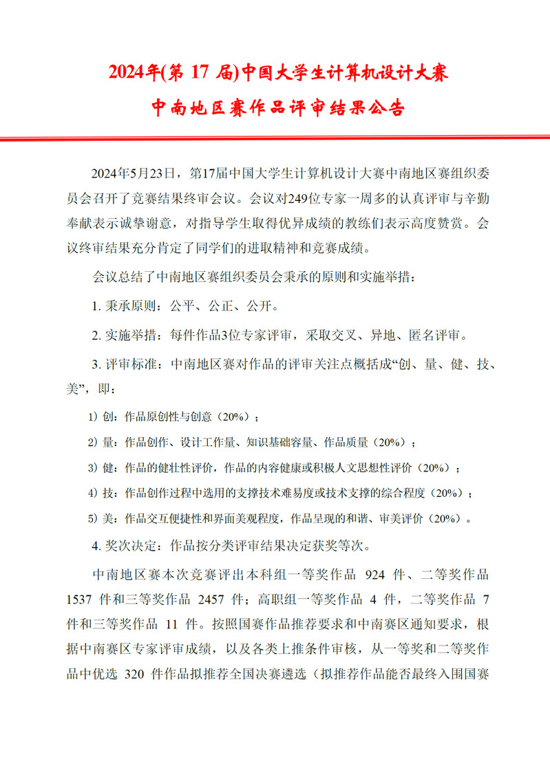 在促进信息技术创新与教育深度融合的背景下,第17届中国大学生计算机设计大赛中南赛区的赛事于近期顺利结束,我校伟德国际victor1946在激烈的竞争中表现出色,共计获得55个奖项,创下历史最佳成绩。其中,一等奖14项(推荐参加国赛2项)、二等奖11项、三等奖30项,这一系列斐然成就不仅体现了学院在物理教育与科研方面的深厚底蕴,也彰显了学生实践创新能力的显著提升。