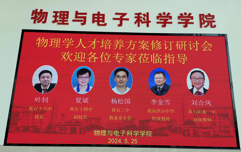 为全面落实《教育部关于深化本科教育教学改革全面提高人才培养质量的意见》、《普通高等学校本科教育教学审核评估实施方案(2021-2025年)》、《普通高等学校本科专业类教学质量国家标准》、学校《伟德国际1946本科专业人才培养方案(2025 版)》等文件精神,伟德国际victor1946于2024年5月25日上午9点在信息大楼10508召开物理学专业2025 版人才培养方案修订研讨会,参加本次研讨会的校外嘉宾有:黄石市第十六中学校长叶钊、黄石市第十四中学副校长夏斌、黄石市第二中学教务室主任杨松国、武汉市洪山高级中学特级教师李金雪、黄石市阳新县一中高级教师刘合凤,校内教学督导、领导、专家和老师有:校教学督导刘堂昆教授、物电学院黄燕霞教授、李江林教授、刘红日教授、丁逊副教授、副院长单传家教授、副院长田开坤副教授、物理系系主任王继国副教授、电子信息系系主任孙四梅副教授、物理系中教法教研室主任樊超杰老师、专业负责人、物电学院教研室主任、实验室主任、物理学系骨干教师和教学秘书等。会议由副院长田开坤主持。