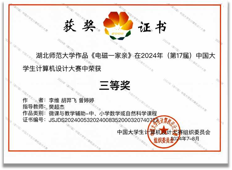 特别值得一提的是,李维团队在樊超杰老师的悉心指导下,凭借作品《电磁一家亲》荣获微课与教学辅助类国家级三等奖。该作品创新性地采用科普视频形式,运用动画、3D建模、AE特效及转场动画等先进计算机技术,将高中物理知识以生动有趣的方式呈现,有效激发了公众对物理学习的兴趣,展现了团队在科普教育领域的独到见解与精湛技艺。
