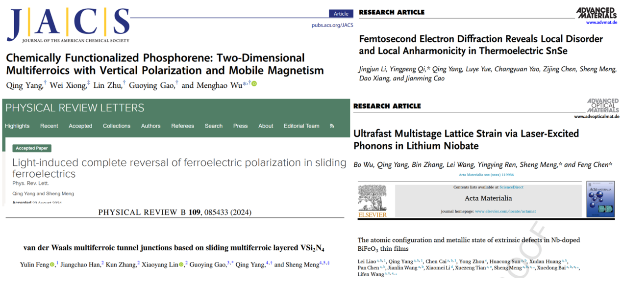 杨庆老师专注于低维多铁性材料的第一性原理设计及多功能应用,超快激光驱动量子材料相变的非绝热动力学过程研究,凭借扎实的理论基础,在凝聚态计算物理领域取得了诸多创新成果。其中,他的代表性研究成果为: