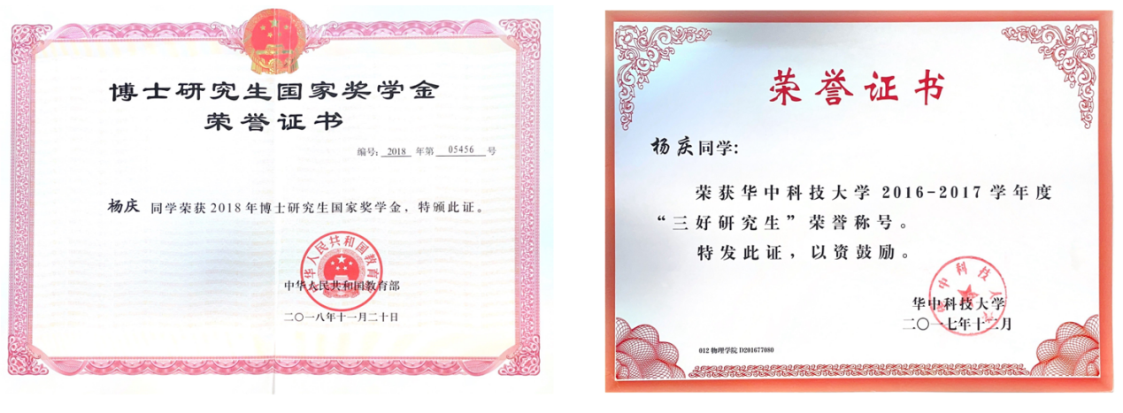 杨庆,生于1993年10月,2015年毕业于华中科技大学物理学院,获学士学位;2020年取得华中科技大学凝聚态物理专业理学博士学位,师承青年长江学者吴梦昊教授。在校期间,屡获研究生国家奖学金、优秀研究生等殊荣。