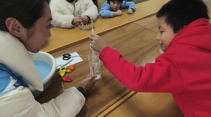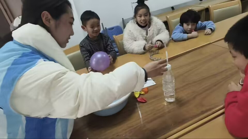 紧接着,气球喷泉实验将气氛推向高潮。讲解员先将气球套在装水的塑料瓶瓶口,接着挤压气球,水竟像喷泉一样从瓶口喷射而出。孩子们被这神奇的一幕深深吸引,一个个跃跃欲试。在实践环节中,小朋友们铆足了劲吹气球做实验,感受科学的乐趣。
