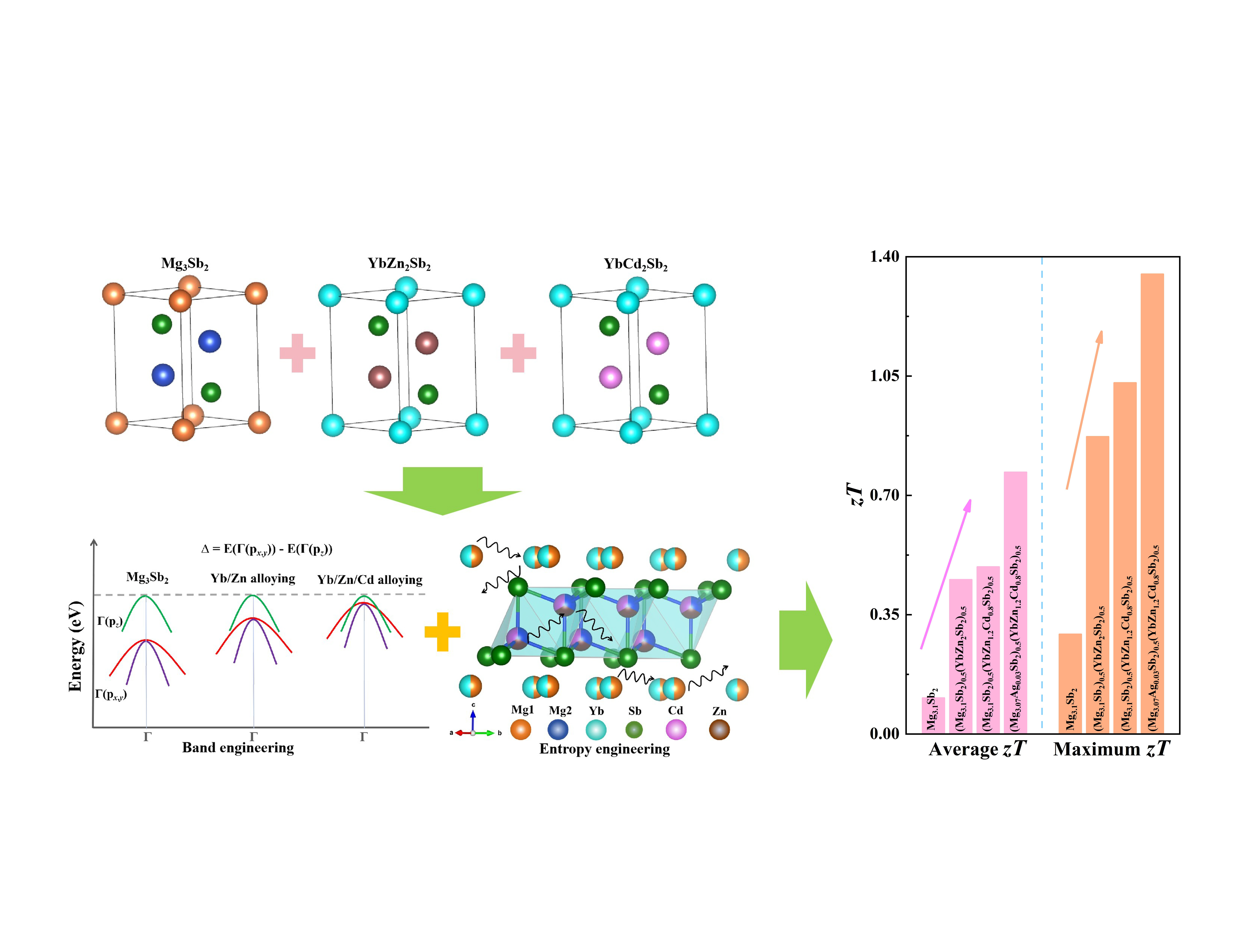 基于半导体热电材料的热电技术在热电发电和主动制冷方面具有广泛的应用前景。如何大幅度优化pMg3Sb2基材料的热电性能是热电领域面临的重要难题。本研究采用能带工程与熵工程协同策略实现了pMg3Sb2基热电材料性能的大幅度提升。通过引入50%YbZn2Sb2,实现了能带结构优化,有效降低了晶体场分裂能,同时提高了载流子浓度和迁移率,使功率因子得到显著增加。在此基础上,采用熵工程,利用Cd合金化调控构型熵值,使(Mg3.1Sb2)0.5(YbZn2-xCdxSb2)0.5样品的晶格热导率得到明显降低。进一步通过精准的Ag掺杂调控空穴浓度,在773 K下获得10.3 µW cm-1 K-2的高功率因子。最终,优化后的材料(Mg3.07Ag0.03Sb2)0.5(YbZn1.2Cd0.8Sb2)0.5 773 K下获得1.34的高zT值,并在323 K-773 K范围内获得0.77的高平均zT值。该研究为高性能pMg3Sb2基热电材料设计提供了一种切实可行的性能优化策略。