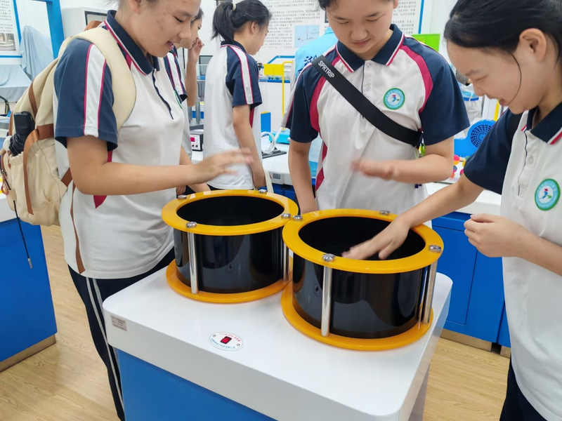 在辉光球实验展示环节,随着电源开启,漆黑的球体内部瞬间迸发出绚丽光芒。当讲解员的手指靠近时,光芒如灵动的精灵般追随指尖舞动。面对同学们此起彼伏的惊叹与提问,讲解员用通俗易懂的语言解释原理,引发大家热烈讨论,现场互动氛围十分活跃。
