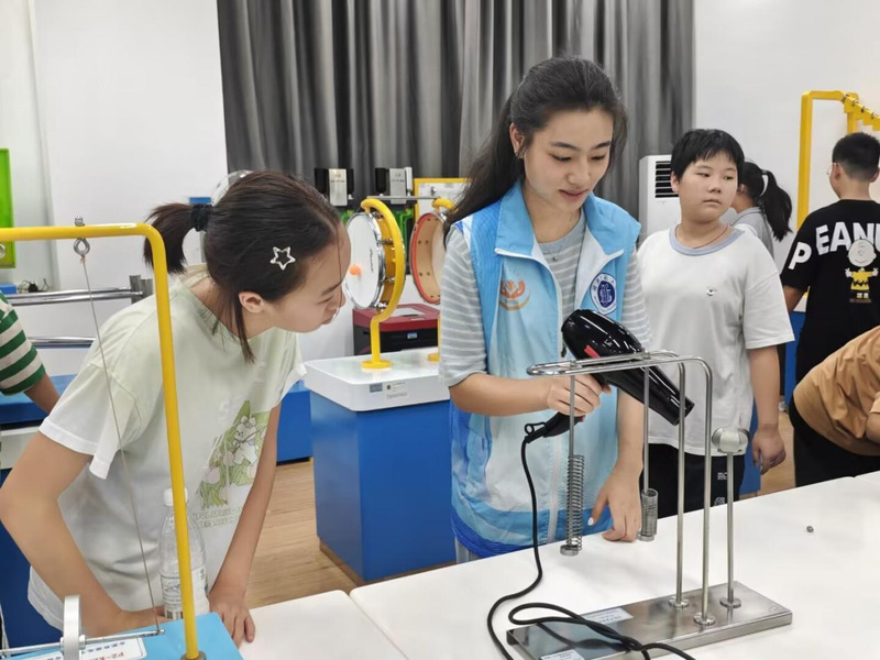 活动首站聚焦互动体验区的“鱼洗盆”实验。在讲解员指导下,同学们轻擦盆边双耳,盆内水面瞬间泛起涟漪,水珠随摩擦节奏跳跃,奇妙现象引发阵阵惊叹。讲解员随即结合力学与振动原理,用生活化语言拆解“喷水”奥秘,将抽象的物理知识转化为直观体验,让同学们快速理解实验背后的科学逻辑。