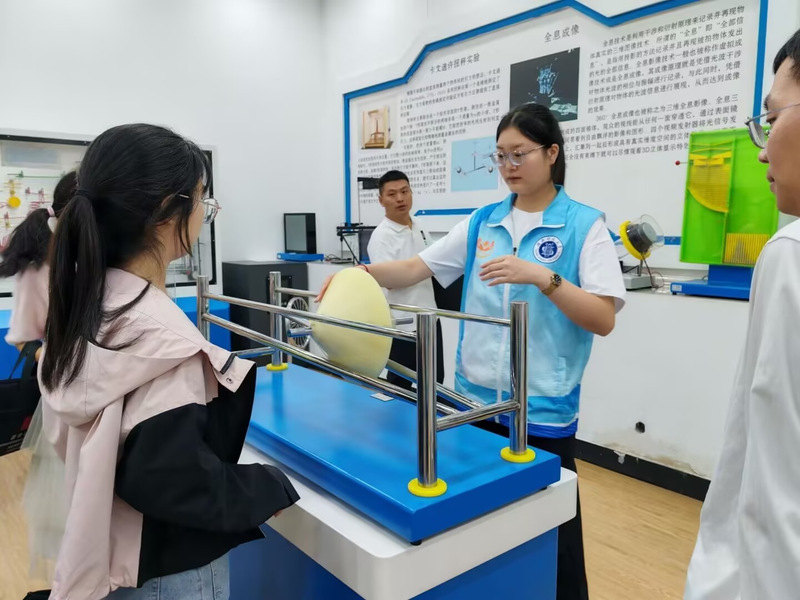 随后,“锥体上滚”实验带来别样科学惊喜。“看似向上滚动的椎体,实则是重力与斜面的精妙博弈。”讲解员一语道破视觉错觉背后的科学真相——轨道的特殊设计,让椎体“上滚”的表象下,隐藏着重心不断下降的规律。学员们围聚在装置旁,反复观察椎体运动轨迹,对力学原理的具象化呈现连连称赞。