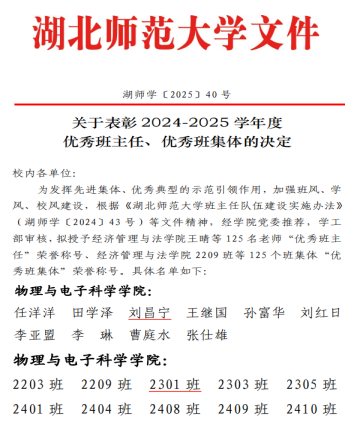 学风是班级发展的核心动力。刘昌宁注重培育互助共进的班级文化,营造温暖融洽的集体氛围。在莫惠淋、李文涵同学生病期间,同学们主动关心、轮流照料,展现出深厚的同窗情谊;学习上成立互助小组,及时帮助有困难的同学,形成“不让一人掉队”的良性机制。在团结协作的基础上,班级逐步形成你追我赶、力争上游的学习风气。班级整体学习目标明确,态度端正,成绩稳步提升,平均成绩位列全院前茅,多人获得各类奖学金与荣誉称号。在“挑战杯”“物理实验创新设计竞赛”等国家A类竞赛中屡获佳绩。