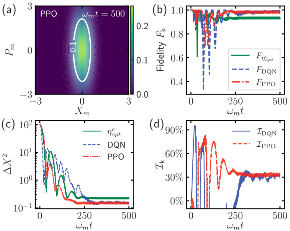 进展压缩态是一种在特定相位方向上具有量子涨落减少的量子态,是量子计量学和信息处理领域的重要资源。腔光力学系统是生成此类压缩态的典型平台,其中周期性控制已被证明是该系统产生强机械压缩的有效方法之一。本文提出了一种基于深度强化学习(DRL)的增强方法。通过结合深度Q网络(DQN)和近端策略优化(PPO)算法,我们优化了时间依赖的控制序列。结果表明,机器学习驱动的控制方法设计的控制场可有效抑制反旋转波项的影响,从而突破传统量子控制策略的压缩度极限,其中PPO算法实现的压缩效果优于DQN。此外,我们的DRL方案在腔体衰减和控制时间延迟等干扰下展现出良好的鲁棒性。本工作将协方差矩阵动力学映射到强化学习框架,拓展了人工智能在连续变量量子系统中的应用范围。研究成果以“Strong optomechanical squeezing generation via deep reinforcement learning”(基于深度强化学习的强光力压缩制备) 为题,发表于 Physical Review A,113, 033504 (2026)。论文第一作者为2022级硕士研究生张文,通讯作者为量子光学与量子信息团队熊标副教授其他作者包括东北大学赵成松博士、量子光学与量子信息团队刘继兵教授和单传家教授。
